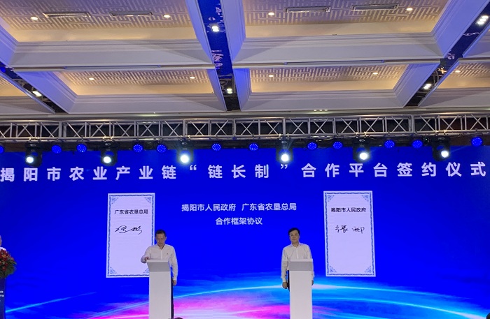 5月27日,揭陽市人民政府舉行揭陽市農(nóng)業(yè)產(chǎn)業(yè)鏈“鏈長制”合作平臺簽約儀式。省農(nóng)墾集團公司(省農(nóng)墾總局)黨委副書記、董事、總經(jīng)理(副局長)馮彤出席活動。