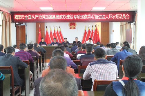為深入貫徹落實揭陽市委六屆六次全會精神,揭陽市全面從嚴治黨加強基層政權(quán)建設專項巡察組將進駐普寧各鄉(xiāng)鎮(zhèn)場街道,對普寧市28個鄉(xiāng)鎮(zhèn)場街道568個村(社區(qū))黨組織(延伸到村民小組)開展為期三個月的全面從嚴治黨加強基層政權(quán)建設專項巡察。2019年3月19日,揭陽市全面從嚴治黨加強基層政權(quán)建設專項巡察第47組組長吳振旭帶領其他成員共3人進駐大坪農(nóng)場。3月20日上午,大坪農(nóng)場召開市全面從嚴治黨加強基層政權(quán)建設專項巡察工作動員會議,會議由場黨委書記官錦周同志主持,參加會議的人員有揭陽市委專項巡察組全體同志,普寧市掛鉤大坪農(nóng)場領導,場機關(guān)全體干部職工、村(社區(qū))“兩委”成員、鄉(xiāng)賢咨詢委員會代表及村民代表等40多人。